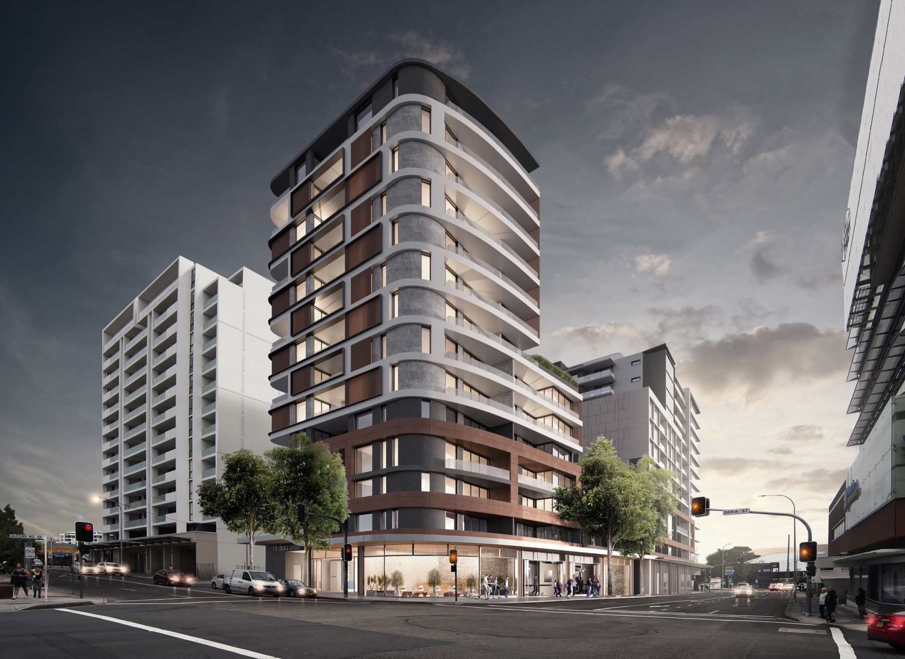 Poised above a lively retail hub, Adora is an intimate collection of one, two and three bedroom apartments. Curved angles and a façade clad with hues of oak